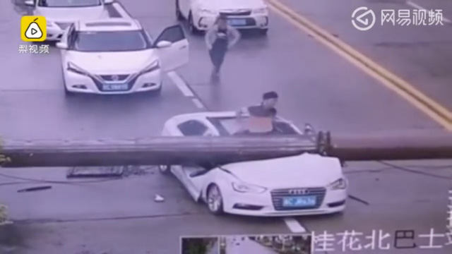 Thần chết bắt hụt một lái xe Audi ở Trung Quốc. Một cần cẩu xây dựng khổng lồ bất ngờ đổ ngang đường và đè bẹp chiếc xe Audi đang lưu thông trên đường. Rất may tài xế thoát chết.