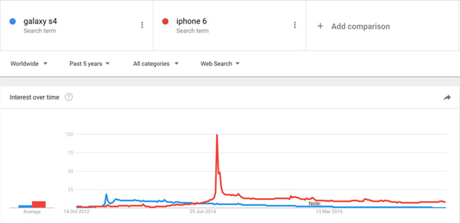 Không smartphone nào nhận được sự quan tâm như iPhone 6. Khi đặt biểu đồ so sánh mức độ quan tâm của người dùng với sản phẩm Apple và Samsung cạnh nhau, có thể thấy được khoảng cách rất lớn giữa iPhone 6 và Galaxy S4.