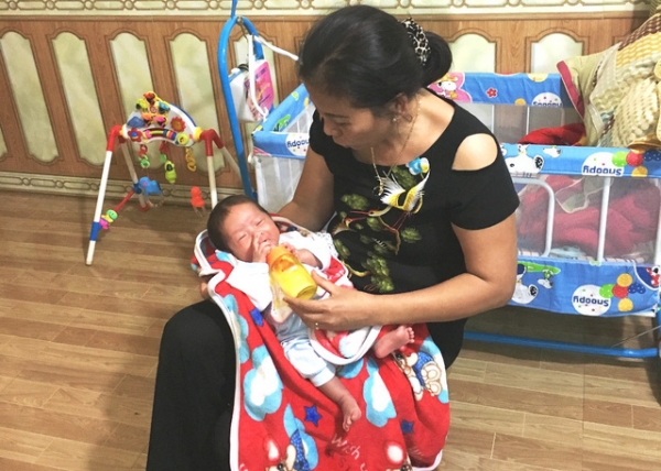 Bà Minh đang chăm sóc cháu bé.