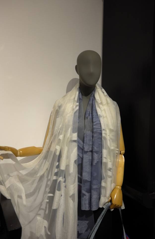 Hình ảnh 1 chiếc khăn lụa Khaisilk mang 2 nhãn mác Made in China và Made in Vietnam.