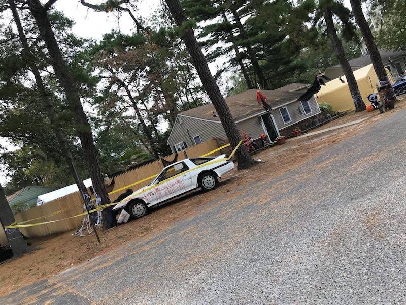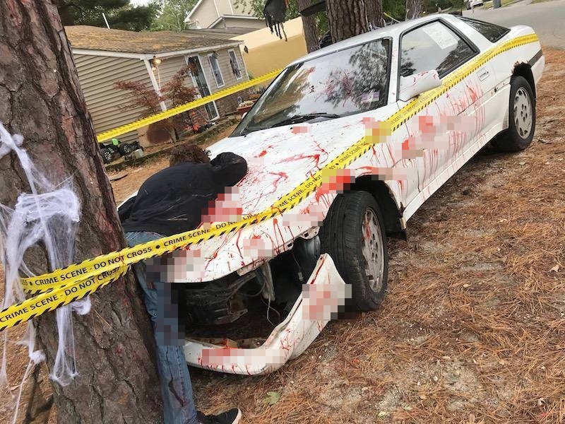 Khi đi ngang qua sân gia đình này, những người đi đường đã hết sức sợ hãi khi thấy cảnh tượng một vụ tai nạn giao thông nghiêm trọng: Người đàn ông bị chiếc ô tô đâm ngang người, cắm vào gốc cây, máu me vương vãi khắp nơi, lại còn có những dải băng phân cách. Ngay lập tức, họ đã gọi điện báo cho cảnh sát địa phương tới. Tuy nhiên khi tới nơi, tất cả mới vỡ lẽ đó chỉ là đồ trang trí Halloween. Chủ nhà, anh Krysten Negrotto giải thích: