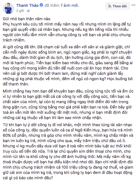 Dòng trạng thái khá dài của Thanh Thảo nhắc lại chuyện người bạn thân cũ chiếm đoạt công ty và sim số của cô.