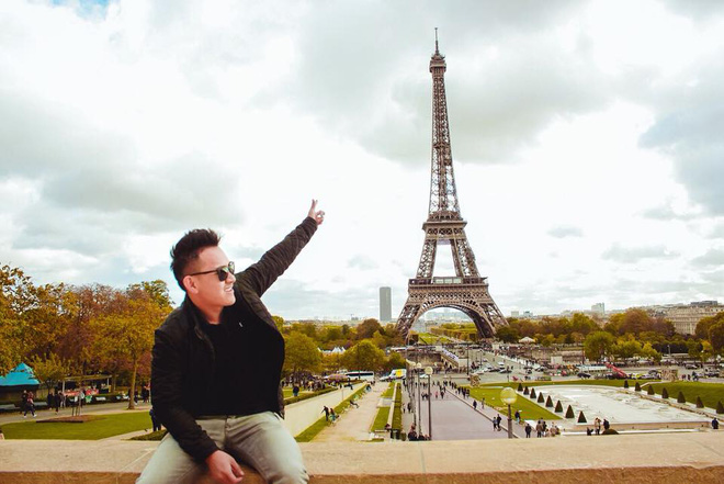 Thành Vinh chia sẻ, công việc mới giúp anh thỏa mãn niềm đam mê du lịch. Anh có thể đến bất kỳ nơi đâu của hãng American Airlines mà không bị giới hạn về số lượng, lại còn được đưa ba mẹ, vợ con hoặc bạn gái đi cùng. Trong ảnh, con trai Hoài Linh sung sướng khoe khoảnh khắc khám phá Thủ đô Paris (Pháp).