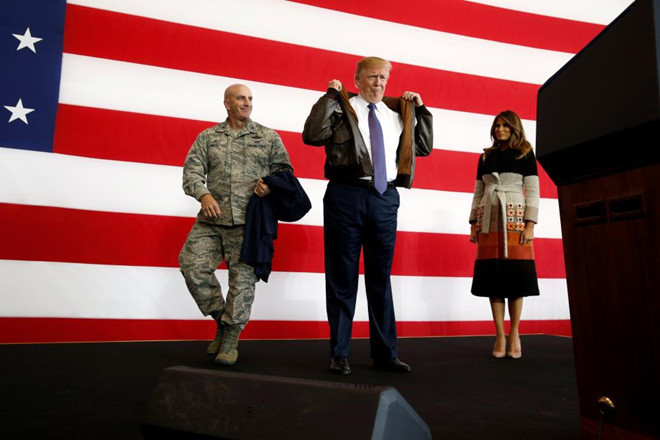Ông Trump mặc áo khoác bay chuyên dụng trước khi phát biểu tại căn cứ không quân ở Tokyo.