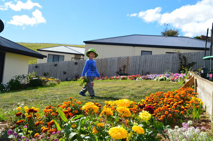 Bé Bin, con trai chị Luyến, thỏa sức chơi đùa trên thảm cỏ xanh, bao quanh là những loài hoa sặc sỡ.