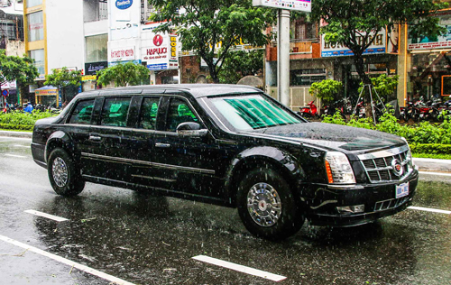 Cặp 'siêu limousine' bọc thép của Tổng thống Mỹ đã tới Việt Nam. Cặp xe "Quái thú" chạy dưới trời mưa ở Đà Nẵng. Hai chiếc Cadillac sẽ thực hiện nhiệm vụ hộ tống ông Trump trong những ngày ở Việt Nam.