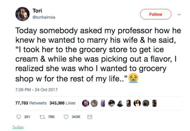 “Tôi và Vicky vừa đi xem phim về thì quyết định tạt vào cửa hàng tạp hóa bên đường mua chút thực phẩm cho ngày mai. Chúng tôi đến quầy kem và khi nhìn cô ấy đứng chọn mùi, tôi bỗng nhận ra một điều rằng suốt cả đời này, tôi và nàng sẽ cùng nhau đi mua thực phẩm như vậy”.