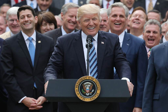 Tổng thống Trump cùng các nghị sĩ Cộng hòa vui mừng tại Vườn Hồng sau khi Hạ viện phê chuẩn kế hoạch bãi bỏ phần lớn chương trình chăm sóc sức khỏe của cựu Tổng thống Barack Obama và thay thế bằng chương trình y tế của đảng Cộng hòa hồi tháng 5. (Ảnh: Reuters)