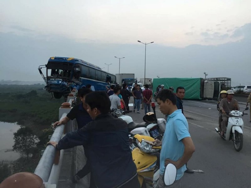 Thời điểm trên, chiếc xe khách đang di chuyển theo hướng Hà Nội đi QL5, lên đến cầu Thanh Trì thì bất ngờ va chạm một chiếc xe tải, chệch hướng đâm sang phía làn đường bên kia.