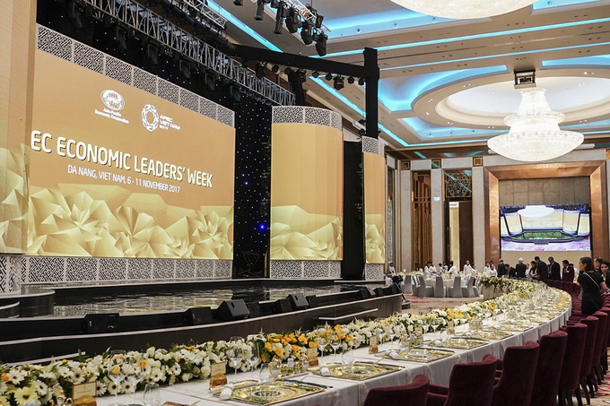 Tối 10.11, yến tiệc thiết đãi các lãnh đạo APEC đã diễn ra tại Đà Nẵng. Bàn tiệc trang trí hoa với tông màu chủ đạo trắng và vàng. Chủ tịch nước Trần Đại Quang tối qua chủ trì lễ đón chính thức và tiệc chiêu đãi các lãnh đạo APEC tại khách sạn ven biển ở Đà Nẵng.