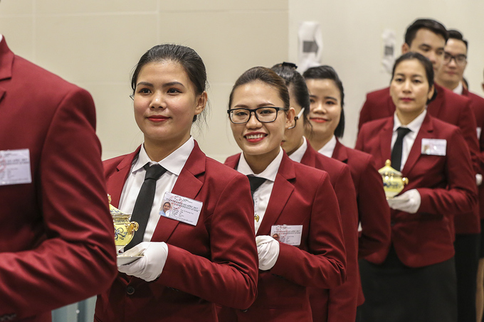 Các nhân viên của khách sạn Sheraton mang bảng tên chuẩn bị đồ ăn từ phía sau cánh gà, xếp thành hàng dài theo vị trí phục vụ, và tiến vào phục vụ khi người điều hành hướng dẫn.