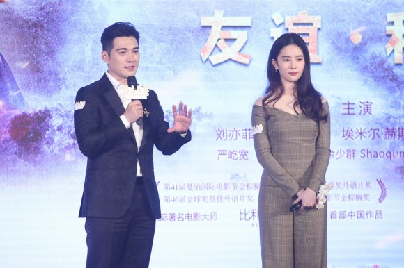 Lưu Diệc Phi chụp ảnh cùng nam diễn viên Nghiêm Khoan tại sự kiện.
