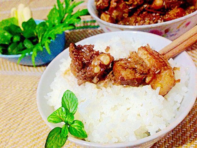 Sườn non giả cầy ăn với cơm trắng hoặc bún kèm rau thơm các loại (lá mơ lông, quế, tía tô, kinh giới, húng cây, sả...) đều rất ngon nhé!