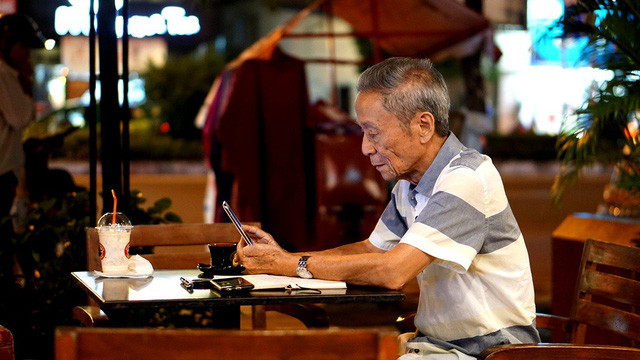 Thủ tướng chỉ nhấp vài ngụm cà phê chứ không uống vì cà phê Sài Gòn khá đậm. (Ảnh: Ông Hiệp mở lại các bài viết trên mạng xem lại hình ảnh của mình và Thủ tướng Canada Trudeau)