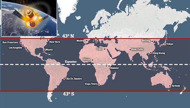 Hay nói rõ hơn là các mảnh vỡ của Thiên Cung 1 có thể phân tán khắp các thành phố lớn, như LA, New York của Mỹ, hoặc các nước châu Âu như Pháp, Tây Ban Nha, Ý,... Đáng chú ý, các nước châu Á trong đó có Việt Nam cũng nằm trong vùng nguy hiểm theo dự báo của ESA.