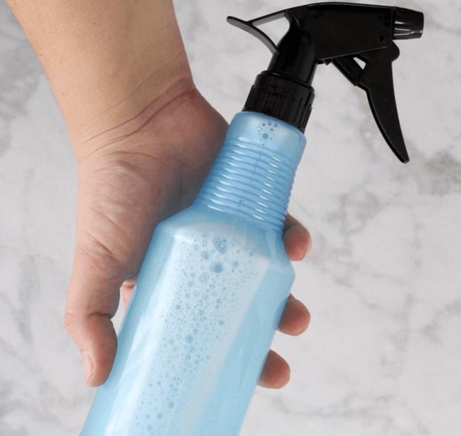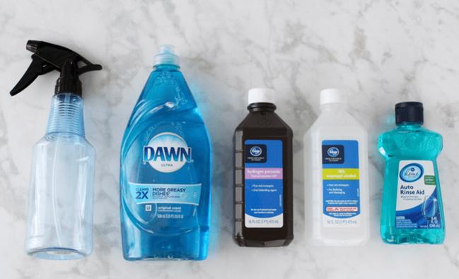 Bước 1: Đầu tiên, bạn đổ Peroxide, cồn, xà phòng, nước rửa chén vào bát và hoà tan. Tiếp tục bỏ dung dịch hoà tan này vào bình xịt.