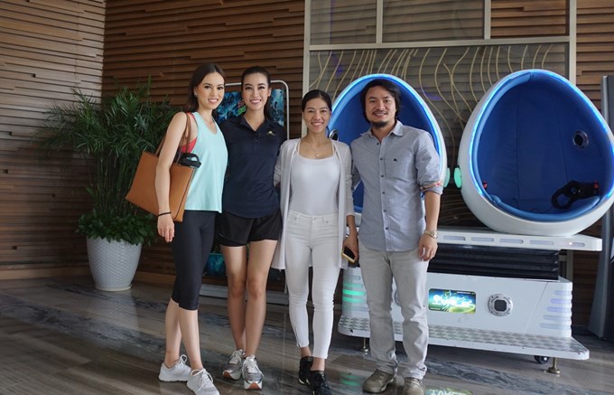 Hoa hậu Mỹ Linh và bạn cùng phòng người Philippines cùng bà Phạm Kim Dung, đạo diễn Hoàng Nhật Nam.
