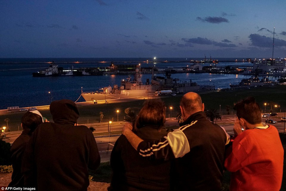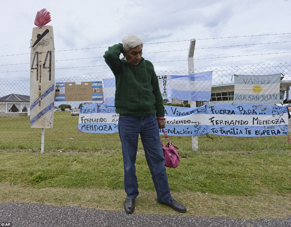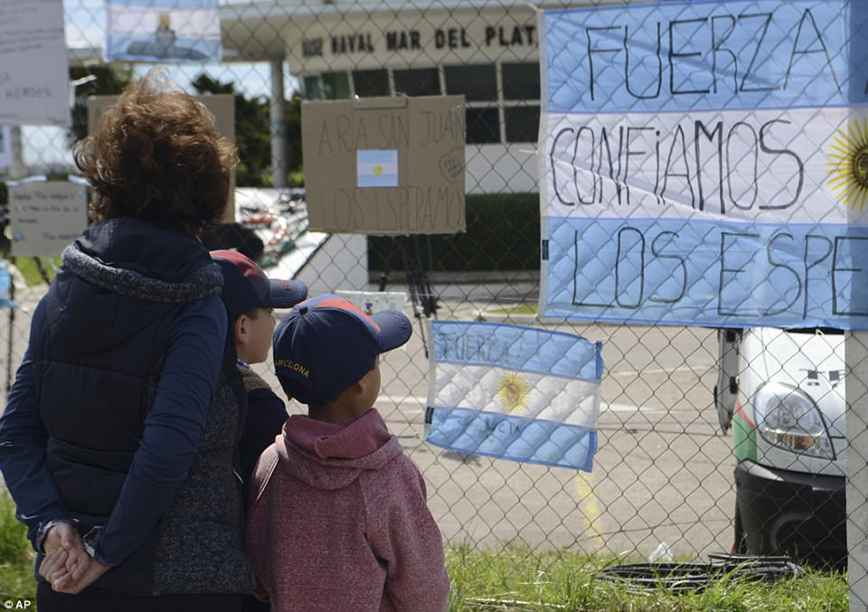 Các gia đình chờ đợi bên ngoài căn cứ hải quân với hy vọng sẽ nhận được tin vui về con tàu. Trước đó, tàu ngầm ARA San Juan mất tích trên Đại Tây Dương, khi đang di chuyển từ căn cứ Ushuaia đến cảng Mar del Plata với 44 thành viên thủy thủ đoàn. Nó chứa lượng lương thực đủ cho các thủy thủ dùng trong nhiều ngày, bất chấp bị gián đoạn liên lạc với đất liền. Ảnh: AP.