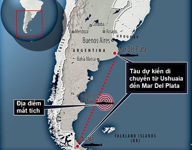 Đồ họa mô phỏng vị trí mất tích và hành trình dự kiến của tàu ARA San Juan. Đồ họa: Cetusnews.