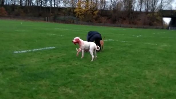 Video quay lại cho thấy máu chảy ra từ miệng chó ngao sau khi chúng bất ngờ tấn công chó săn thỏ.