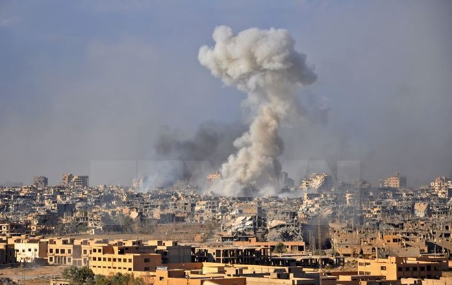 Khói bốc lên sau một cuộc không kích nhằm vào các vị trí của IS tại Deir Ezzor, Syria ngày 31/10.