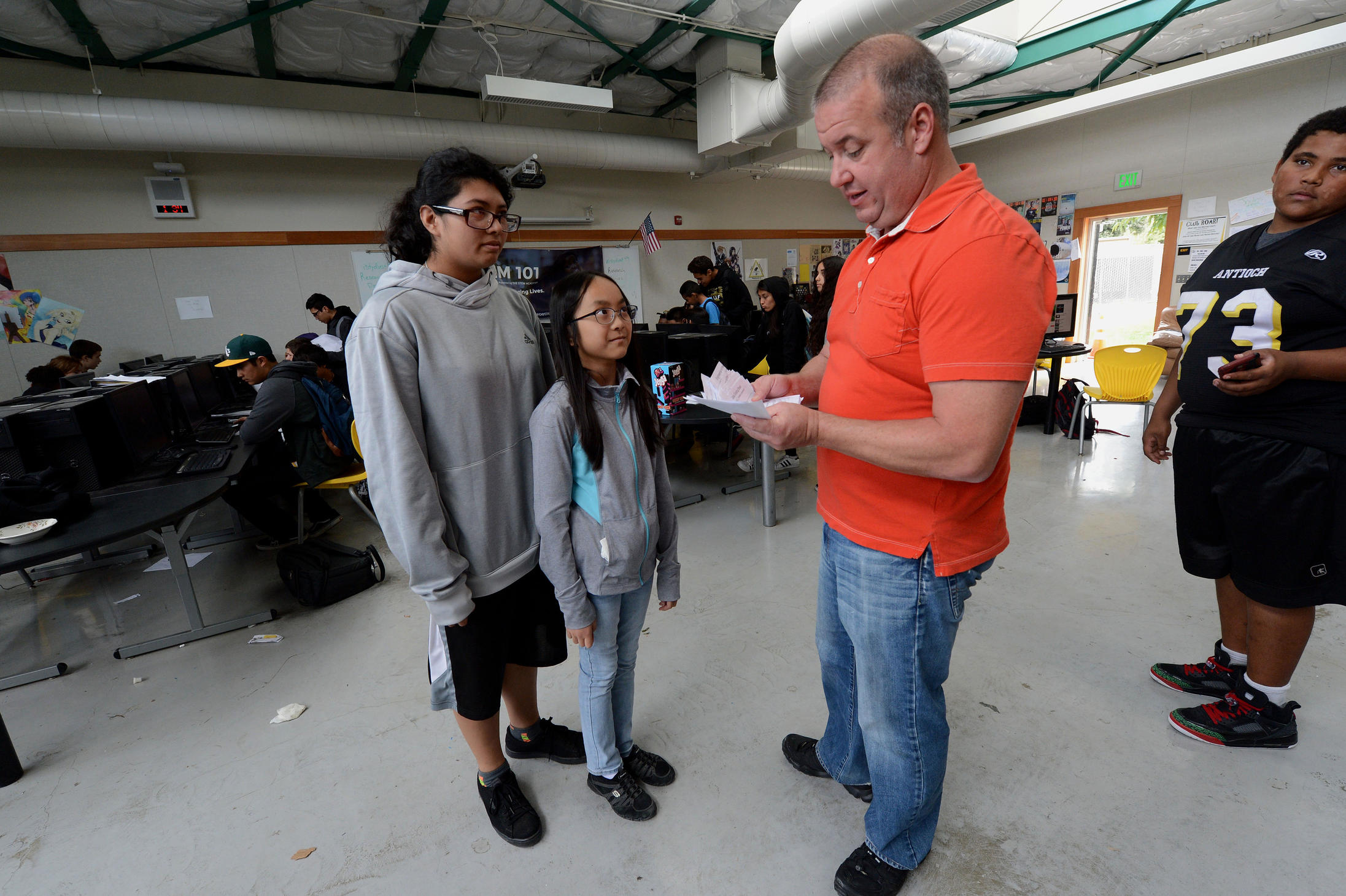 Ella Nguyễn với các học sinh khác lớn xác gấp đôi. (East Bay Times)