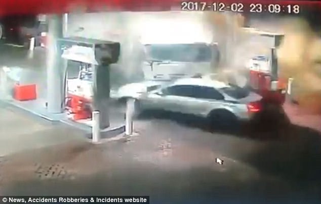 Theo đó, một chiếc xe tải 16 tấn do mất lái đã lao thẳng vào trạm xăng với vận tốc hơn 50 km/h, tông trực diện vào một chiếc Mercedes màu bạc đang tiếp nhiên liệu ở bên trong.