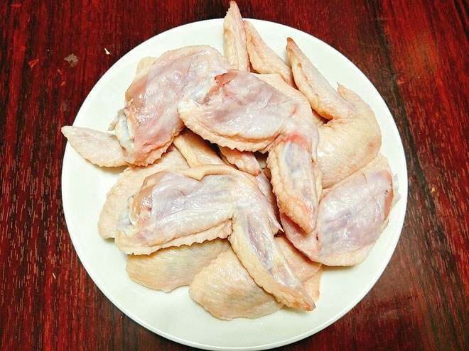 - Bước 1: Cánh gà đem bóp kỹ với 1 chút muối, giấm rồi rửa lại vài lần cho sạch, để cho ráo nước rồi chặt cánh gà làm 2 hoặc 3 đoạn.