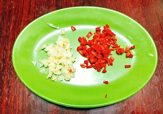 - Bước 3: Ớt sừng rửa sạch băm nhỏ, tỏi bóc vỏ rồi băm nhỏ.