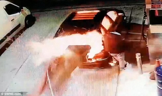 Theo những hình ảnh được camera an ninh ghi nhận lại cho thấy, một người đàn ông đang tựa người vào chiếc Mercedes màu đen để bơm xăng vào bình. Nhưng chỉ vài giây sau, chiếc xe đột nhiên phát nổ, một ngọn lửa lớn từ bên trong xe phá vỡ cửa kính sau bắn ra ngoài.