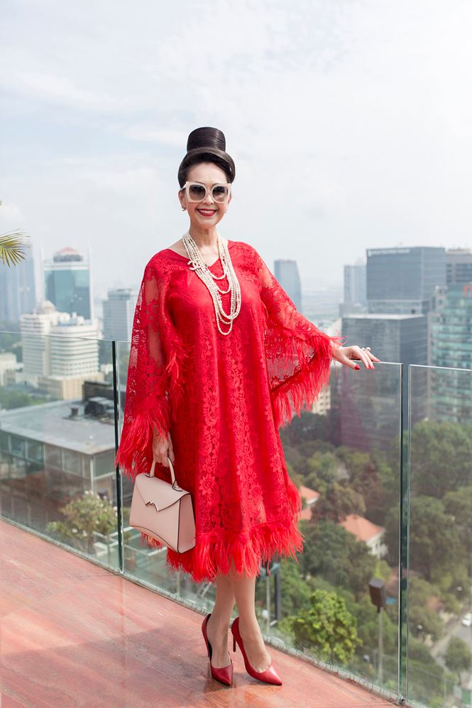 Diễm My diện đầm màu đỏ, phom rộng trên nền chất liệu ren kết hợp chi tiết lông đính kết. Nữ hoàng ảnh lịch vẫn trung thành với kiểu trang điểm, làm tóc cầu kỳ, sang trọng.