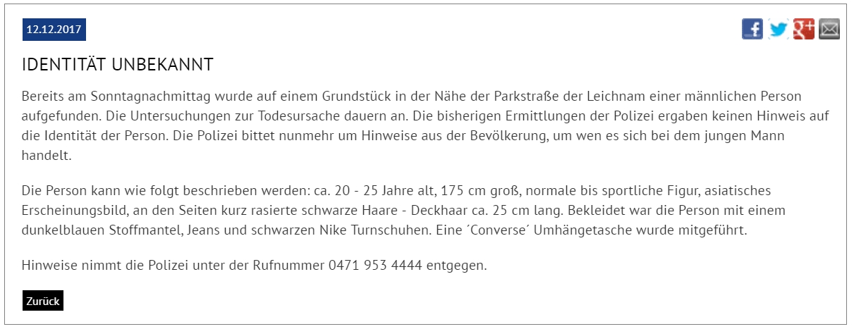 Thông báo của Cảnh sát hôm 12.12.2017: https://www.polizei.bremerhaven.de/i...annt-9806.html
