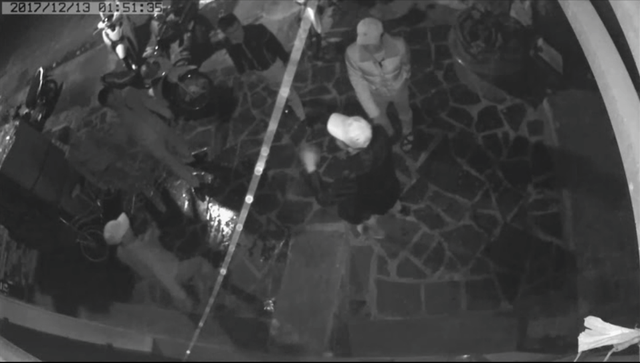 Các đối tượng nhảy nhót, la hét trước cửa nhà chị Trang được camera an ninh ghi lại lúc 1 giờ 51 phút rạng sáng 13/12