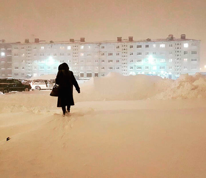 Thành phố Norilsk đang trải qua hiện tượng được gọi là Đêm Bắc Cực (Polar Night), trong đó người dân sẽ không nh́n thấy mặt trời suốt hơn 6 tuần. Vừa ch́m trong bóng tối cả ngày, họ vừa phải đối mặt với những đợt tuyết rơi dày và các cơn băo tuyết.