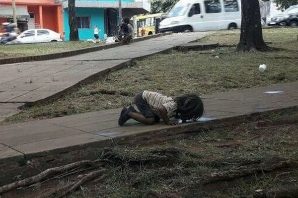 Trong khi nhiều bé được nâng như nâng trứng, hứng như hứng hoa thì hình ảnh em bé này khiến nhiều người rơi nước mắt. Một bé gái với mái tóc rối bời, quỳ gối liếm một vũng nước bẩn trên đường giữa trời nắng oi ả khiến không ít người rơi nước mắt. Bé mới chỉ 3-4 tuổi ở khu vực Mbya Guarani, Posadas, Argentina, đang quỳ gối và uống nước từ một vũng nước đọng lại bên đường được dân mạng truyền nhau.