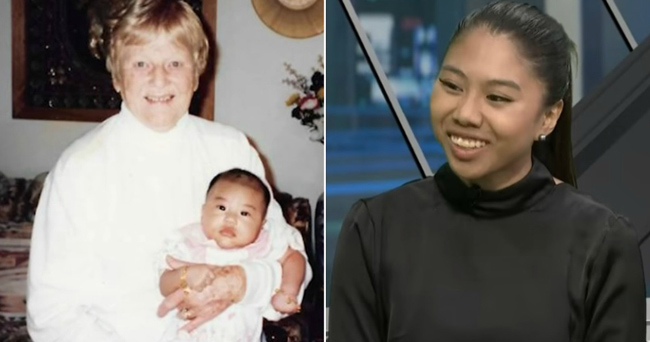 Bà nội bế Erica khi cô còn nhỏ (trái) và Erica hiện tại (phải).