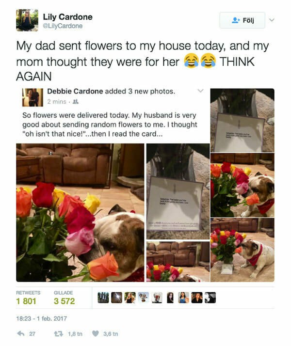 Người vợ đã vô cùng hạnh phúc khi được chồng gửi tặng hoa. Thế nhưng, khi cô đọc dòng chữ trên thiệp, cô vô cùng bất ngờ. Hóa ra đóa hoa đó được gửi cho chú chó của gia đình cô chứ không phải cô