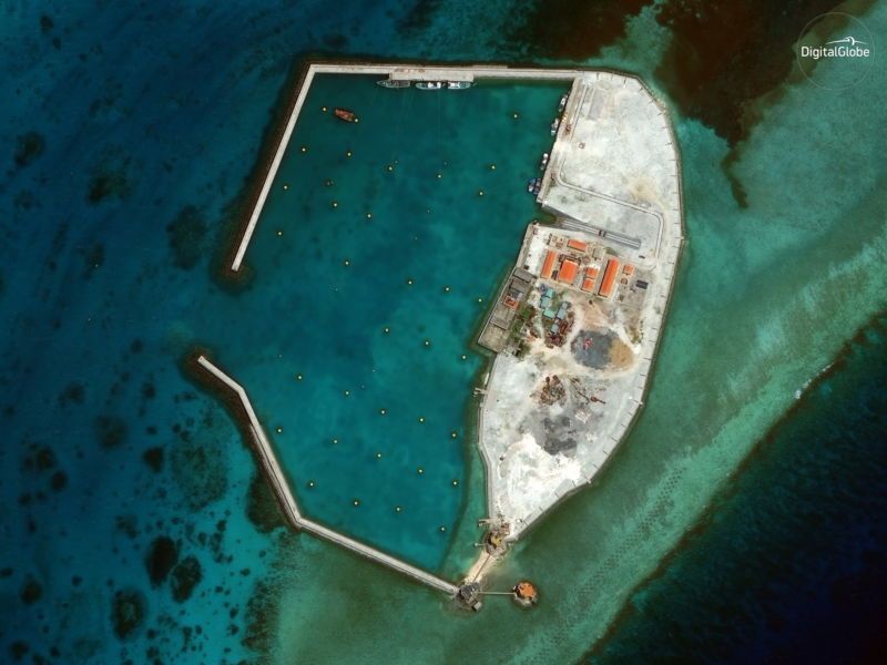Theo những con số phỏng định của Trung Tâm CSIS tại Washington, DC được Bloomberg dẫn lại, từ năm 2014, Việt Nam đã bồi đắp thêm tại 10 đảo và bãi đá ngầm ở Trường Sa với tổng cộng diện tích khoảng 120 hécta. Trong khi đó, với các tàu lớn đào xới, hút cát đá lòng biển, Trung Quốc đã biến 7 bãi đá ngầm mà họ cướp của Việt Nam từ năm 1988 thành những đảo nhân tạo khổng lồ với diện tích tổng cộng khoảng 3,200 hécta. Hiện nay, các hành động xây dựng phi trường, cảng biển, các cơ sở quân sự gồm cả các giàn radar, hỏa tiễn phòng không, nhà để máy bay, các cơ sở truyền tin viễn thông đã hoàn tất.