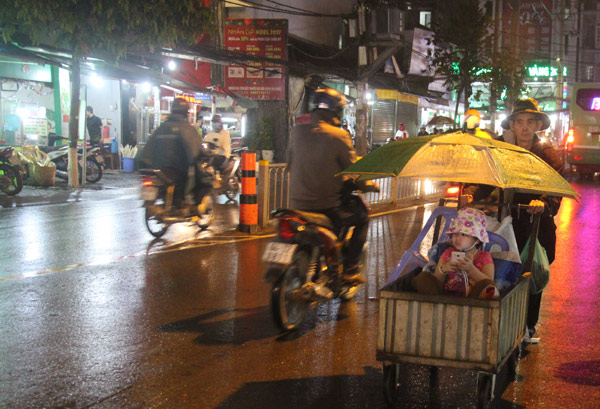 Tối 25/12, trời Sài Gòn trở lạnh do ảnh hưởng bão 16 Tembin. Từ trong con hẻm nhỏ trên đường Tân Mỹ (phường Tân Phú, quận 7, TP.HCM), một người đàn ông đứng tuổi, gương mặt rắn rỏi, đẩy một chiếc xe đẩy tay ra đường. Trên xe là một bé gái ăn, đầu đội mũ vải đang ngước nhìn cảnh vật chung quanh.