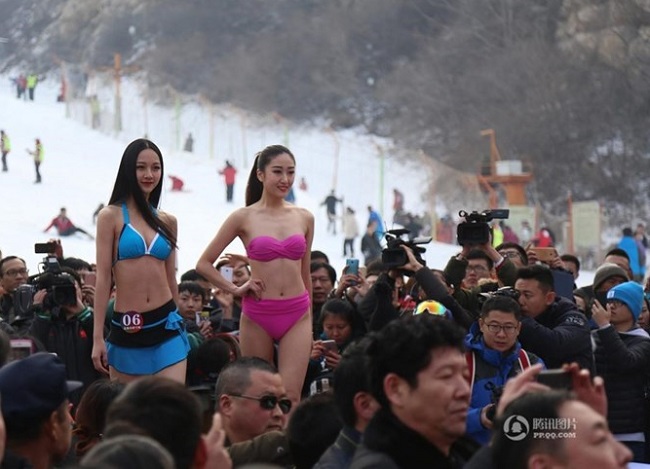 Giữa cái rét căm căm của tuyết trắng, mỹ nhân TQ vẫn mặc bikini biểu diễn