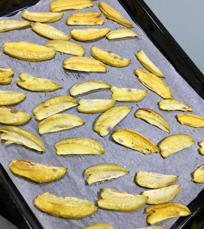 - Đem phơi cho héo, hoặc sấy trong lò 130 độ, 2 lửa (nhớ trở mặt khế) cho khô ráo, thường thì khoảng một giờ.