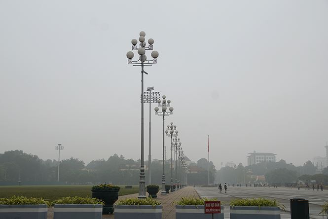 Hiện tượng sương mù kéo dài suốt cả ngày trong mấy ngày qua, quảng trường Ba Đình mịt mù trong sương.