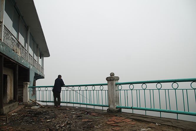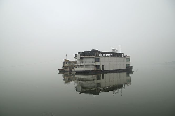 Nhà nổi trên Hồ Tây sau khi bị đình chỉ hoạt động nổi bật giữa làn sương mờ ảo.