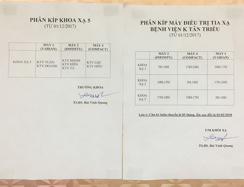 Bảng phân kíp trực máy được dán ngoài Phòng kỹ thuật, Khu Xạ trị kỹ thuật cao, bệnh viện K3.