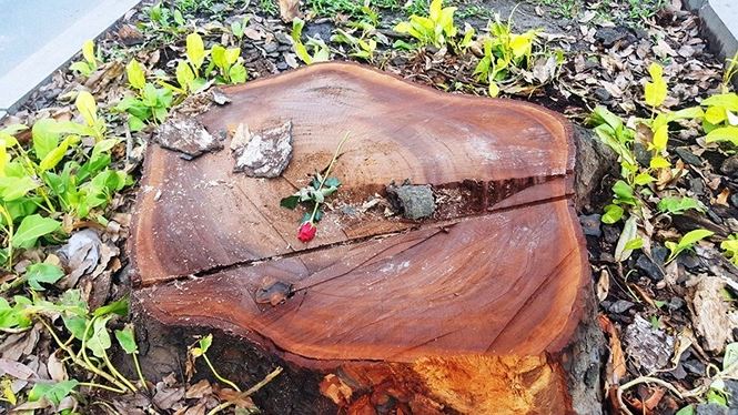 Mỗi gốc cây bị chặt đều có một bông hoa hồng. Nhiều người không khỏi bất ngờ khi chứng kiến sự việc này. Không ai biết người nào đã có một hành động đẹp vô cùng thế này.