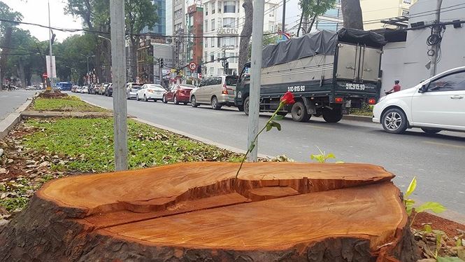 Old  Default TP.HCM: Người bí ẩn đặt bông hồng trên mỗi gốc cây bị chặt ở đường Tôn Đức Thắng
