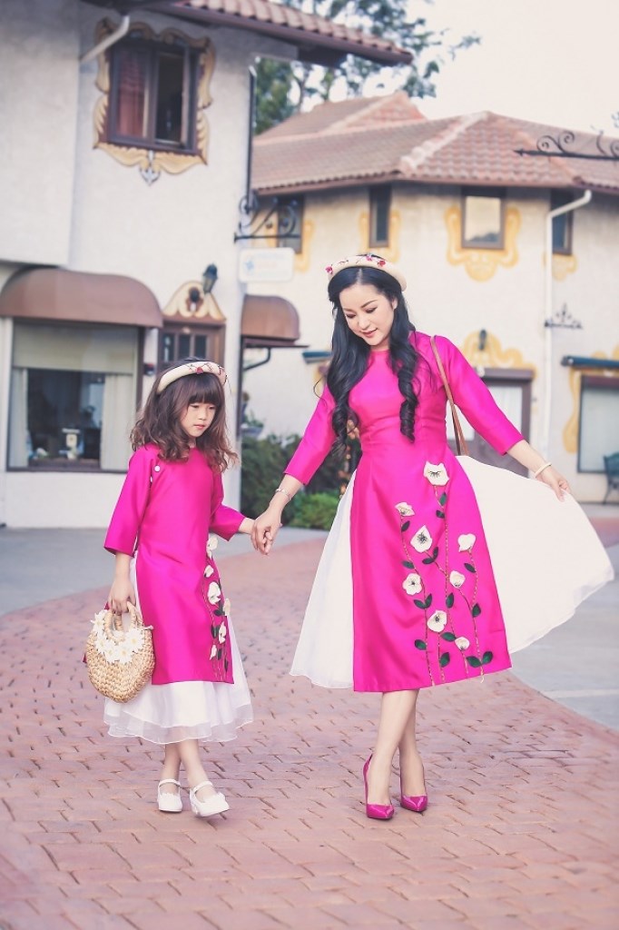Danh hài Thúy Nga và con gái Nguyệt Cát đẹp 'mê ly' trong trang phục đôi được nhà thiết kế Phương Nguyễn Silk và người mẫu Ngọc Quyên thực hiện riêng.