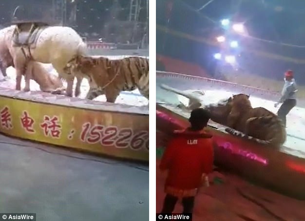 Hổ và sư tử cùng tấn công con ngựa trong lúc luyện tập. Sự việc được ghi lại tại một gánh xiếc nằm ở Thương Châu, Hà Bắc, Trung Quốc.