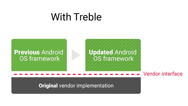 Do vậy, Google đã cố gắng cải thiện vấn đề trên bằng cách đưa ra dự án công nghệ Treble – Treble Project. Đây là nền tảng dạng mô đun (module) cho Android, giúp thiết bị cập nhật độc lập nhanh hơn và không làm xáo trộn các tính năng trên smartphone của các nhà sản xuất.