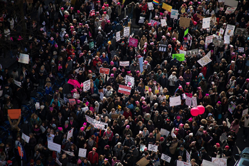 Nhiều phụ nữ tham gia tuần hành đội mũ tai mèo màu hồng để biểu thị sự đoàn kết. Trong khi đó, những người khác mang theo các biểu ngữ phản đối các chính sách của Tổng thống Mỹ.